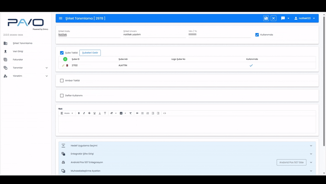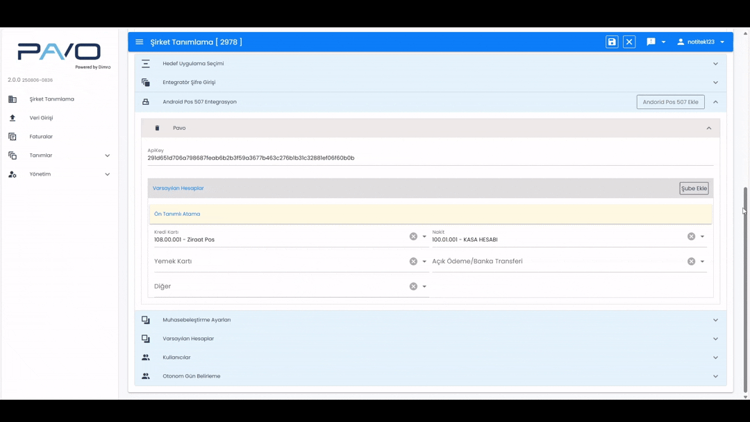 Ayarlar kısmında, Android POS 507 Entegrasyon bölümünde, varsayılan hesaplar altında Kredi Kartı ve Nakit Cari hesaplarına ön tanımlı hesap kodu ataması yapabilirsiniz.
