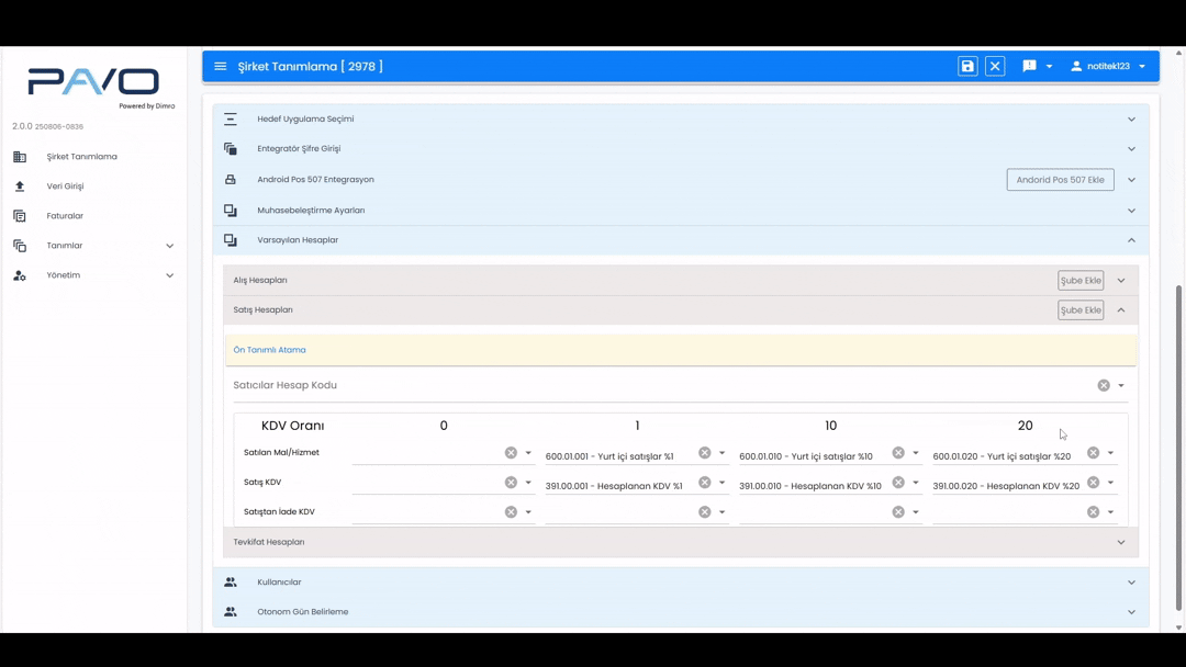 Varsayılan Hesaplar kısmında, Satış Hesapları altında KDV’ye göre hesap kodu ataması yapılıyorsa, burada %1, %10 ve %20 KDV hesap kodlarını tanımlayabilirsiniz. Bu işlemleri gerçekleştirdiğinizde, ilgili hesap kodları otomatik olarak atanmış olarak gelecektir.