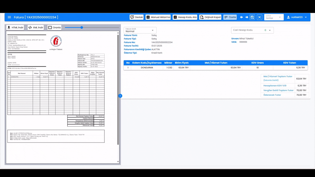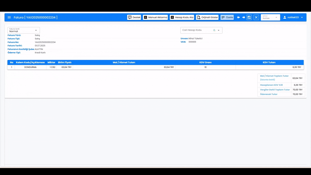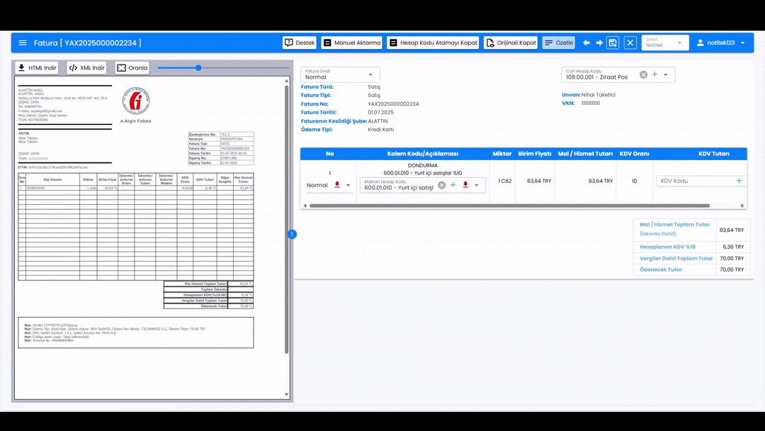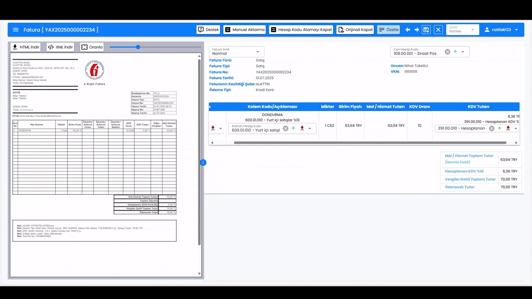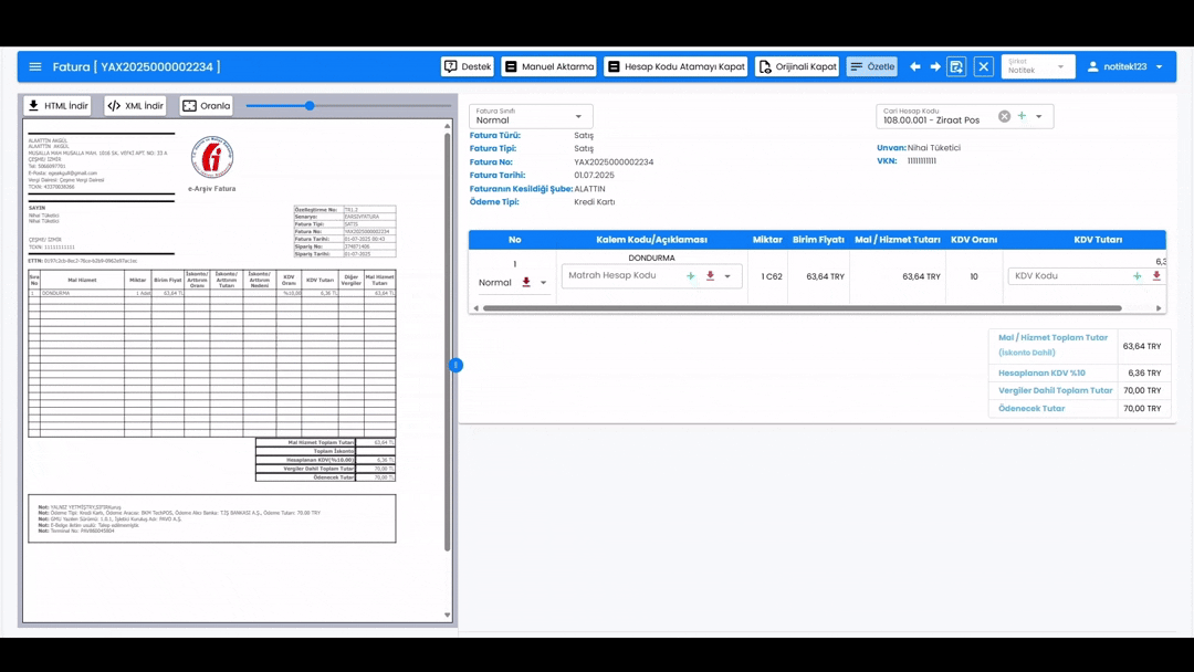 İşleme Başlamadan önce Yukarıdan Orjinalini Göster Butonuna Basarak Faturayı görüntüleyebilirsiniz.